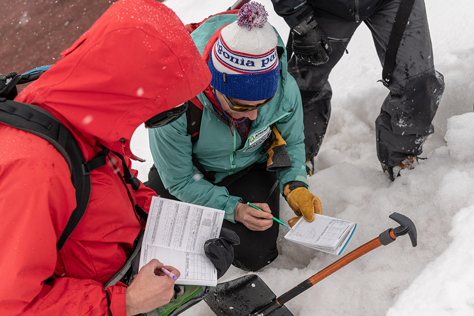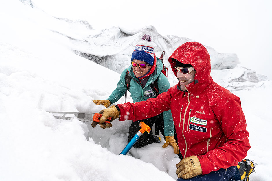 Diego Allolio demonstrated how to use a snow saw, avalanche shovel and probe in a snow pit study exercise. Photography by Esteban Barrera.