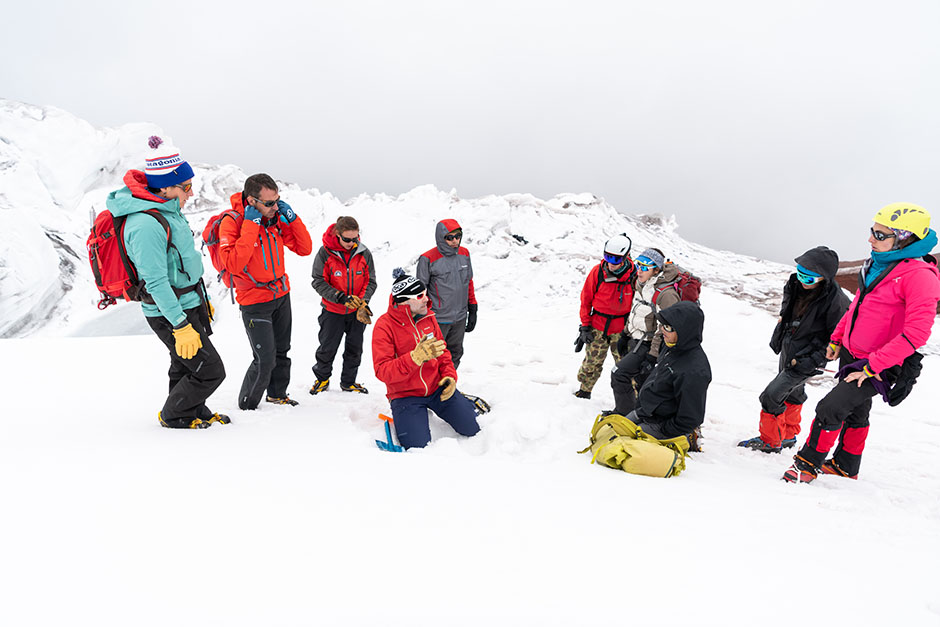 They then moved up to a low-exposure field to dig pits, while staying clear of using glacier gear so they could focus on snow rather than glacier travel. Everyone was required to wear crampons and were fascinated by the unpredictable changes of the volcanic glacier.