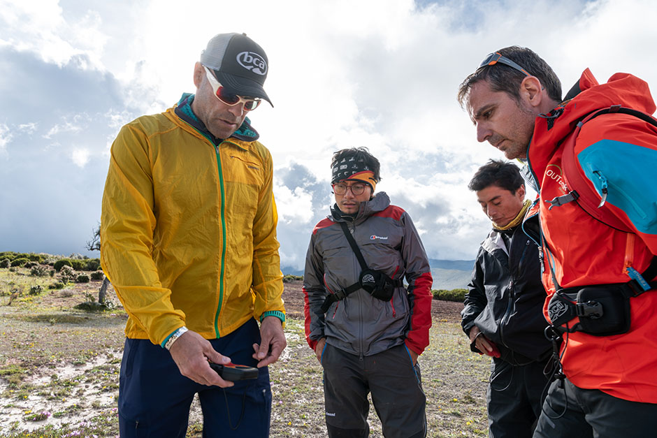 Diego Allolio uses the inclinometer in his compass to measure the slope angle. Photography by Esteban Barrera.