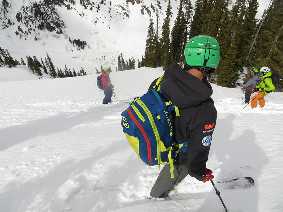 IFMGA Guide and BCA Ambassador Jed Porter discussing terrain options at the top of the Chatanooga Beluga during a hut based AIARE Level 2 course on Red Mountain Pass with Kling Mountain Guides.