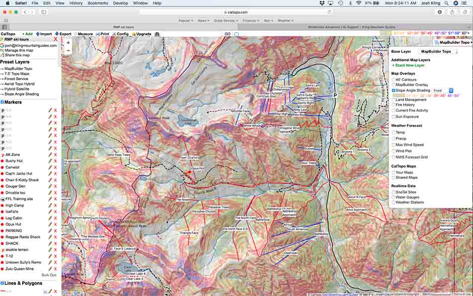 5. What type of terrain do you want to ski?Big open bowls above tree line? Tree runs? Mini-Golf laps? High mileage tours? Different huts lend themselves to different kinds of skiing. Make sure that when you start researching your hut, you look at what type of skiing is adjacent to the hut. Two great resources for this are www.CalTopo.com and Google Earth. Between Caltopo and Google Earth you should be able to get an excellent idea of the type of terrain adjacent to the huts. The slope shading tool on Caltopo is especially useful. If you have the time, consider building a run list on what and where you plan on skiing. What are your options if its stable and blower? What are your options if its super sketchy out?