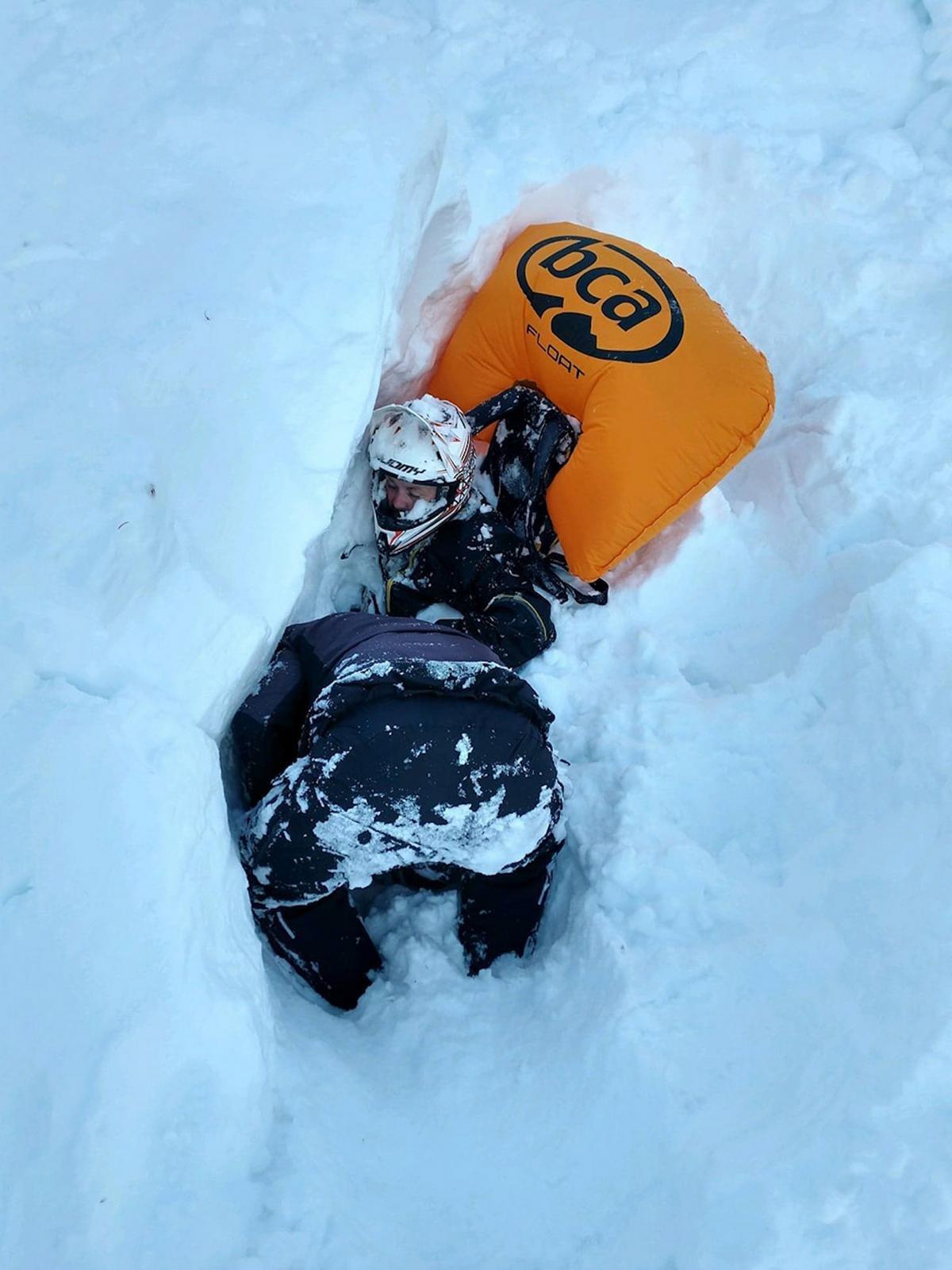 "I fell off of a tall cliff (400ish feet tall). As I fell off I assumed the first impact would kill me and when it didn't I figured if I could deploy the airbag it may help me survive some impacts around my upper body," reported Marty to BCA via Facebook messenger. "I remember reaching for the trigger. I feel the airbag deploying, and having a pack on covering my back really helped keep me stay alive. I feel the airbag did help me stay up close to the surface of the snow when being buried in the avalanche."